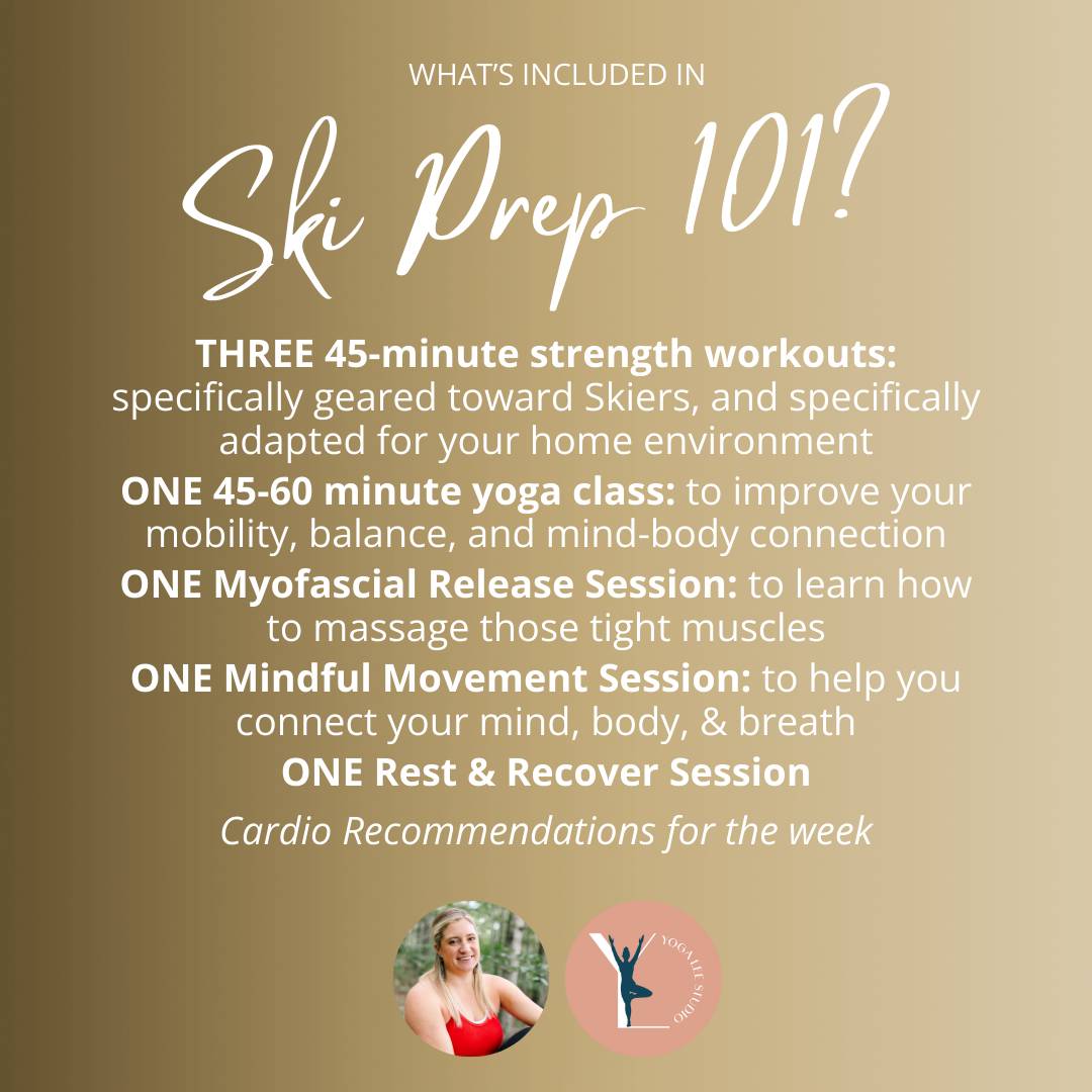 Ski Prep 101 is a 4-week full-body ONLINE training program designed to help you feel powerful, balanced, and ready for the slopes. Built for EVERY body and EVERY level, it blends strength, yoga, mobility, and mindfulness into ONE powerful system.